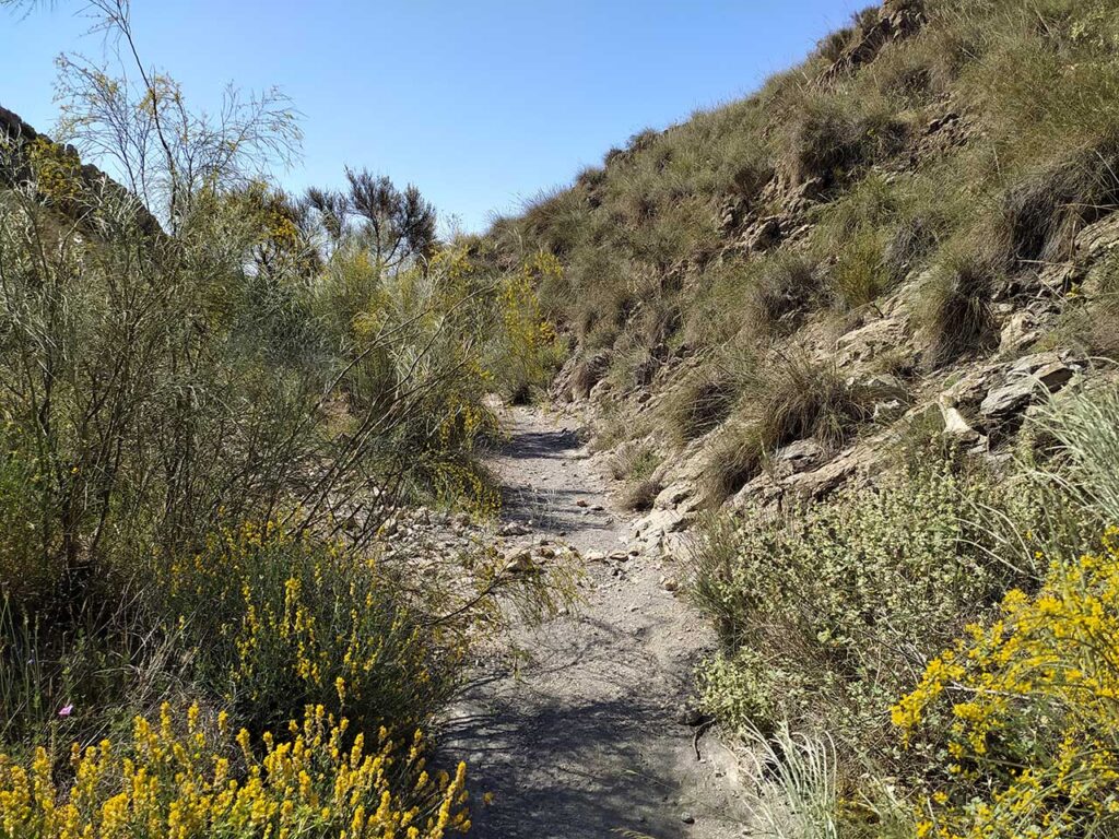 Como vemos en al fotografía, descendemos la rambla disfrutando, de las plantas y siguiendo buscando granates, ya que le agua los arrastra, hasta el sendero de tierra que tomándolo hacia la derecha, llegáremos a nuestro coche.